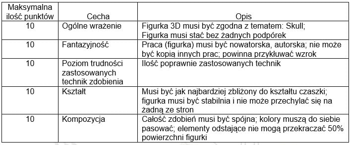 2. Zadaniem uczestnika jest wykonanie wolnostojącej figurki 3D techniką akrylową zgodną z tematem konkurencji – Skull.