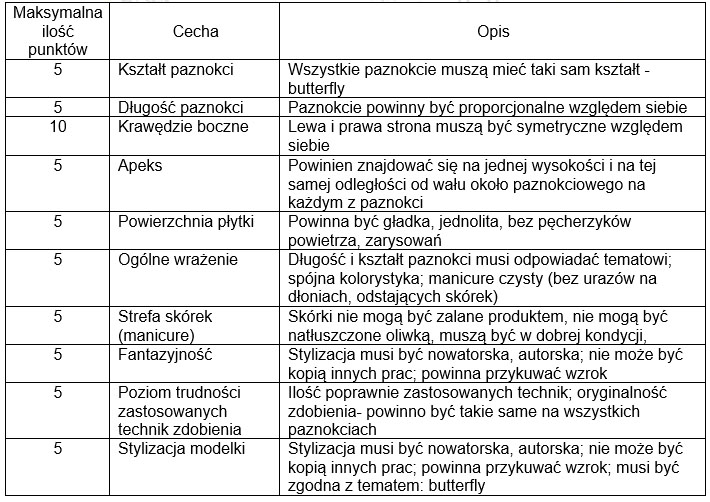 2. Zadaniem uczestnika jest wykonanie stylizacji paznokci w kształcie butterfly wraz z wizerunkiem modelki odpowiadającym tematowi.